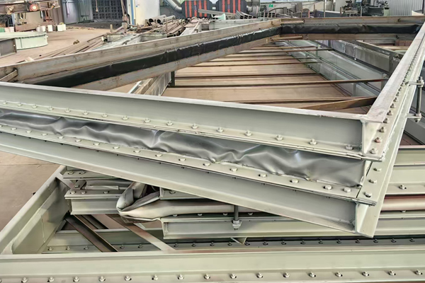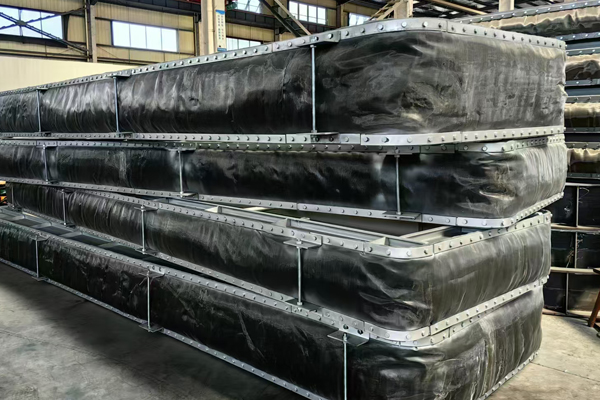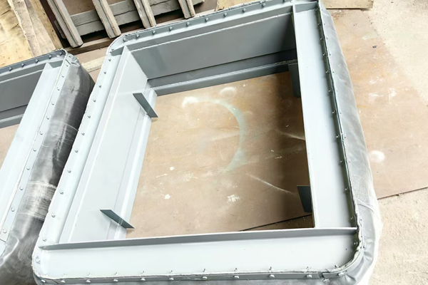 本文中所展示的圖片是我們翔盛環保科技公司近期正在為山東客戶生產制作的一批矩形非金屬補償器(矩形非金屬膨脹節)。非金屬補償器通常由纖維織物蒙皮(硅膠為紅色、氟膠為黑色)與管道接口形狀相同的金屬框架、以及其它的結構件所組成。